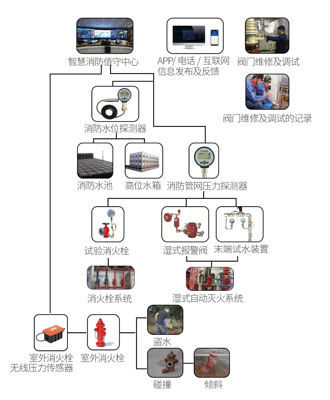 在高位水箱、消防水池、噴淋系統(tǒng)的末端試水裝置及室內外消火栓系統(tǒng)等關鍵部位安裝無線感知設備,實時探測消防栓、噴淋系統(tǒng)、高位水箱水位等數(shù)據(jù),快速識別消防水源異常及故障狀態(tài),實現(xiàn)對室內消火栓管網(wǎng)、噴淋管網(wǎng)和室外消火栓管網(wǎng)的主動管理,保證消防水箱、消防水池、消火栓的水位處于正常水平范圍內,確保消防水源正常使用。