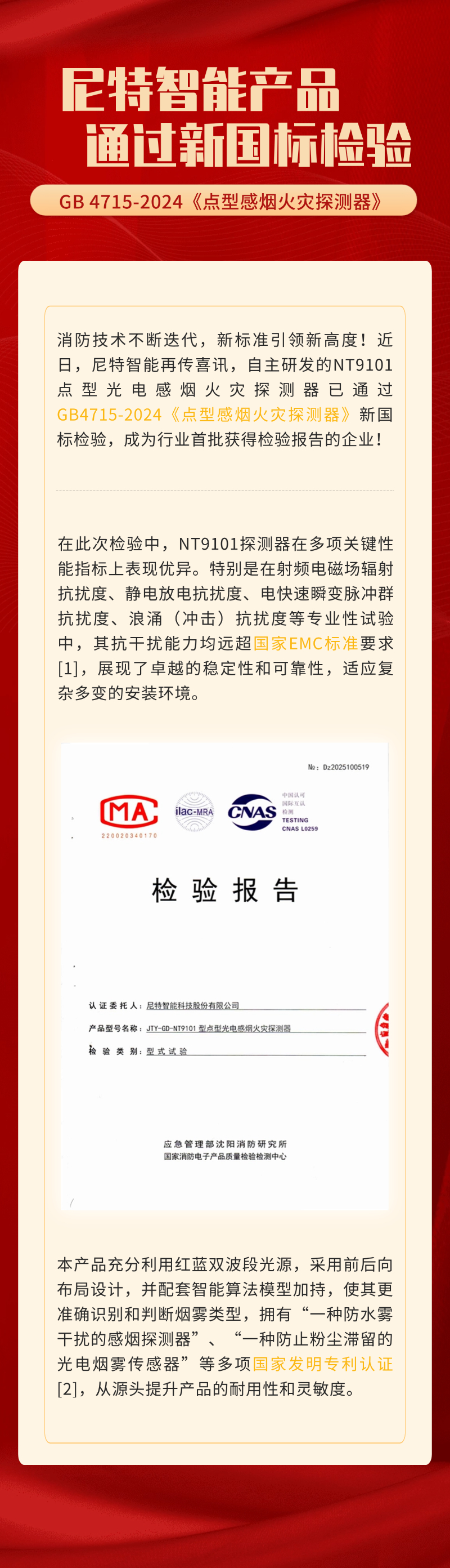 注:[1]在靜電放電抗擾度試驗中,國標要求在接空氣放電8kV,正負極各10次試驗后還可正常工作,尼特可在接空氣放電8.5kV,正負極各50次試驗后保持正常工作;在電快速瞬變脈沖群抗擾度試驗中,國標要求在瞬變脈沖電壓1×(1±0.1)kV下仍可正常工作,尼特技術可在瞬變脈沖電壓1.5kV下保持正常工作;在浪涌(沖擊)抗擾度試驗中,國標要求在浪涌(沖擊)電壓1.1kV下仍可正常工作,尼特技術可在浪涌(沖擊)電壓1.5kV下保持正常工作。