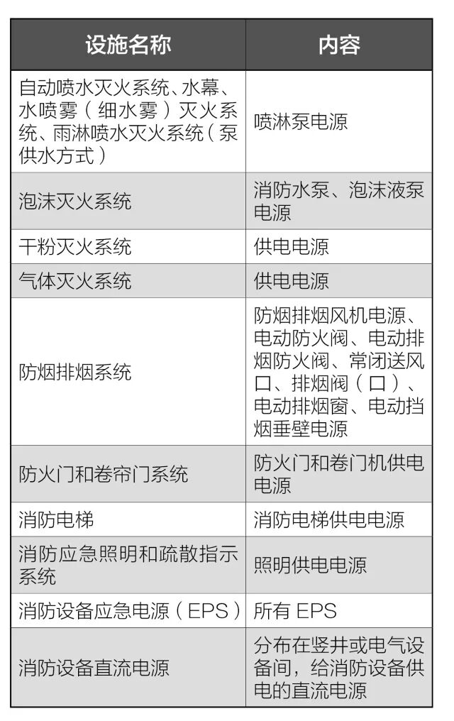 建筑內為消防設備供電的主電源和消防電源的配電柜輸出端;消防電氣控制裝置(包括水泵控制器、風機控制器等)的雙路電源輸入端與輸出端;設置在各防火分區內的消防設備電源裝置(給各消防設備供電的直流電源)的輸出端等。